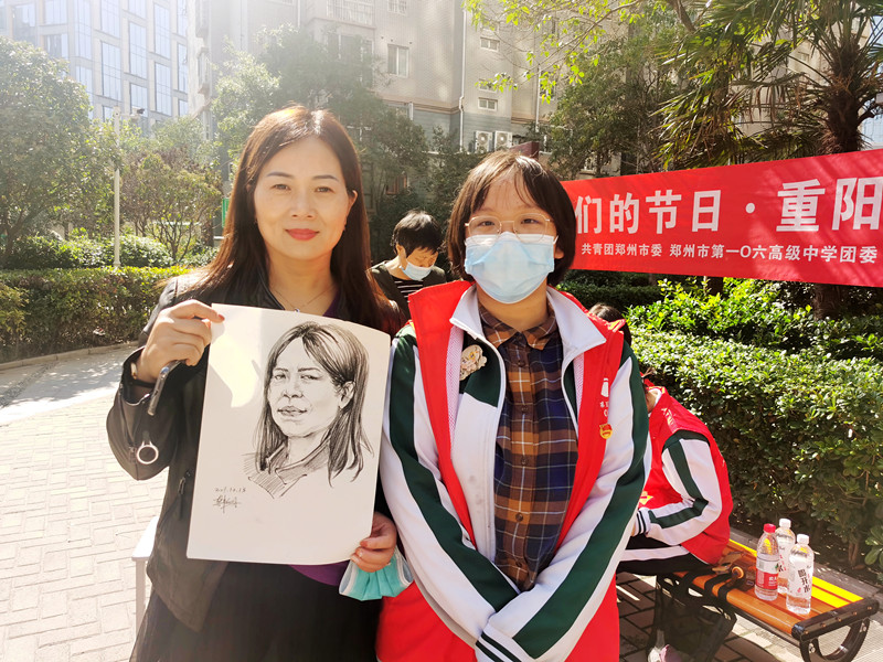“你还记得小时候爷爷抱着你的感觉吗?你还记得奶奶亲你脸蛋的感觉吗?”秋意盎然的季节,总是弥漫着爱与温暖。为培育和践行社会主义核心价值观,充分挖掘重阳节的深厚文化内涵,大力弘扬中华民族尊老爱幼的传统美德,10月13日上午,依托“万名团员进社区”活动载体,郑州市第106高级中学团委开展“我们的节日·重阳节”活动。郑州市第106高级中学的十二名优秀共青团员走进郑州市郑东新区祭城中兴路社区晖达新领地小区积极开展敬老、爱老志愿服务活动,为社区居民送上肖像画做礼物。