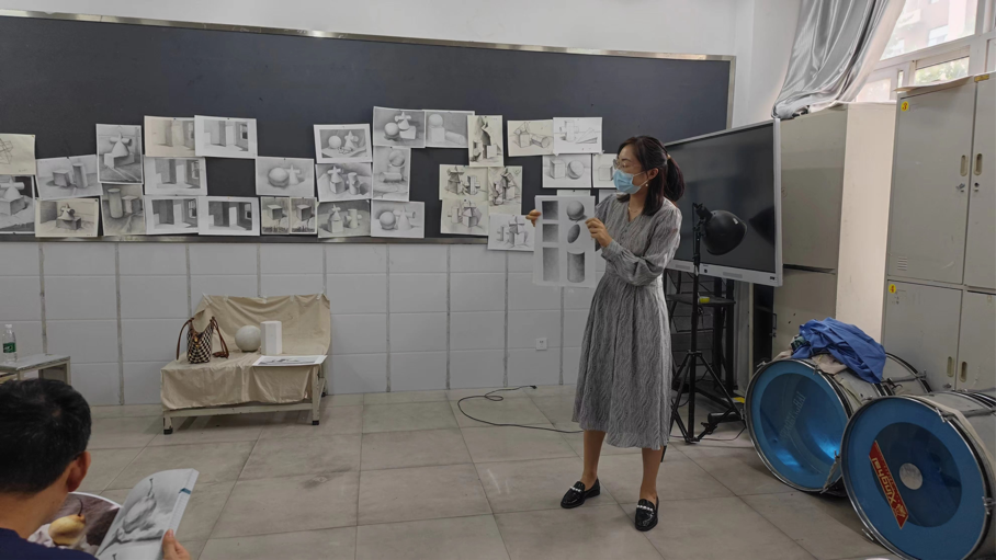 此次教研的主要发言教师是曹小艳老师,曹老师对于素描几何体如何做明暗调子的问题分享了她的独特的教学方法,并拿出了学生的作品为大家展示,老师们都受益匪浅。