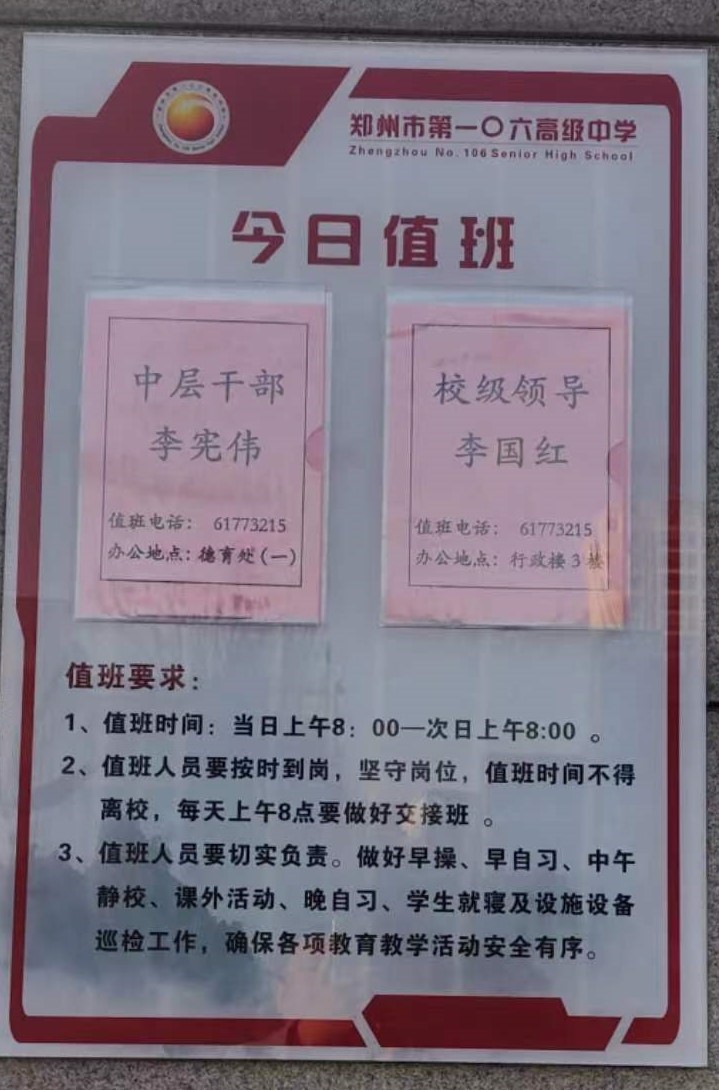 范卫斌说,学校门岗值勤工作至关重要,是确保校园安全的第一道防线,也是展现校园文明的一个窗口。安保人员要落实一日常规要求,门岗要保证二十四小时不间断值守,巡视要保证全校无死角巡查,视屏监控要保证全校无死角覆盖。特别是学生离校、返校、家长会等重要时间节点,全体安保人员要着装规范,坚守岗位,明确职责,既要严防任何事故的发生,又要热情周到的做好服务。日常值守一定要严格落实外来人员的进校管理制度,严防闲杂人员进入校园,提高防恐防暴的安全意识,紧绷安全弦,牢记安全法,坚决不做与值班无关的事情,一心一意保平安,全心全意促和谐。强烈的责任心是做好工作的基础,用规范文明的门岗值守行动擦亮106高级中学和谐校园的窗口,把门岗值守打造成展现校园文明的风景线。