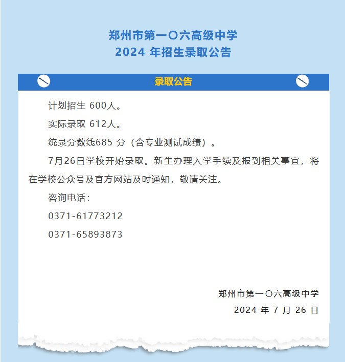 郑州市第一〇六高级中学2024 年招生录取公告