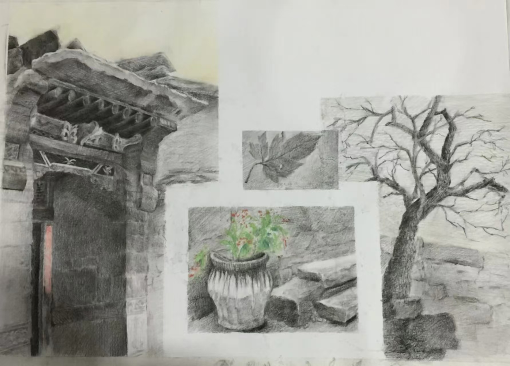 为检验写生期间的收获,离别之际,同学们进行了美术写生测试,用笔墨记录下对石板岩的无尽不舍。