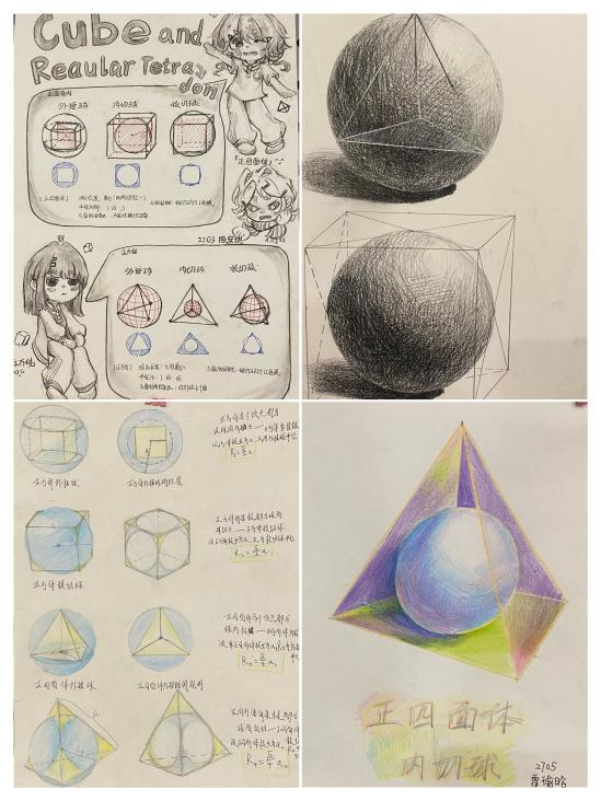 活动要求从六种图形中至少选取两种进行绘制。有的同学运用精准流畅的线条,清晰地勾勒出两者正方体的内切球与外接球之间的位置关系;有的同学则将目光投向正四面体的棱切球与外接球,巧妙地借助绚丽缤纷的色彩,凸显出图形强烈的立体感。在创作过程中,学生们不仅深化了对数学知识的理解,还将艺术审美融入其中,赋予了数学图形别样的魅力。