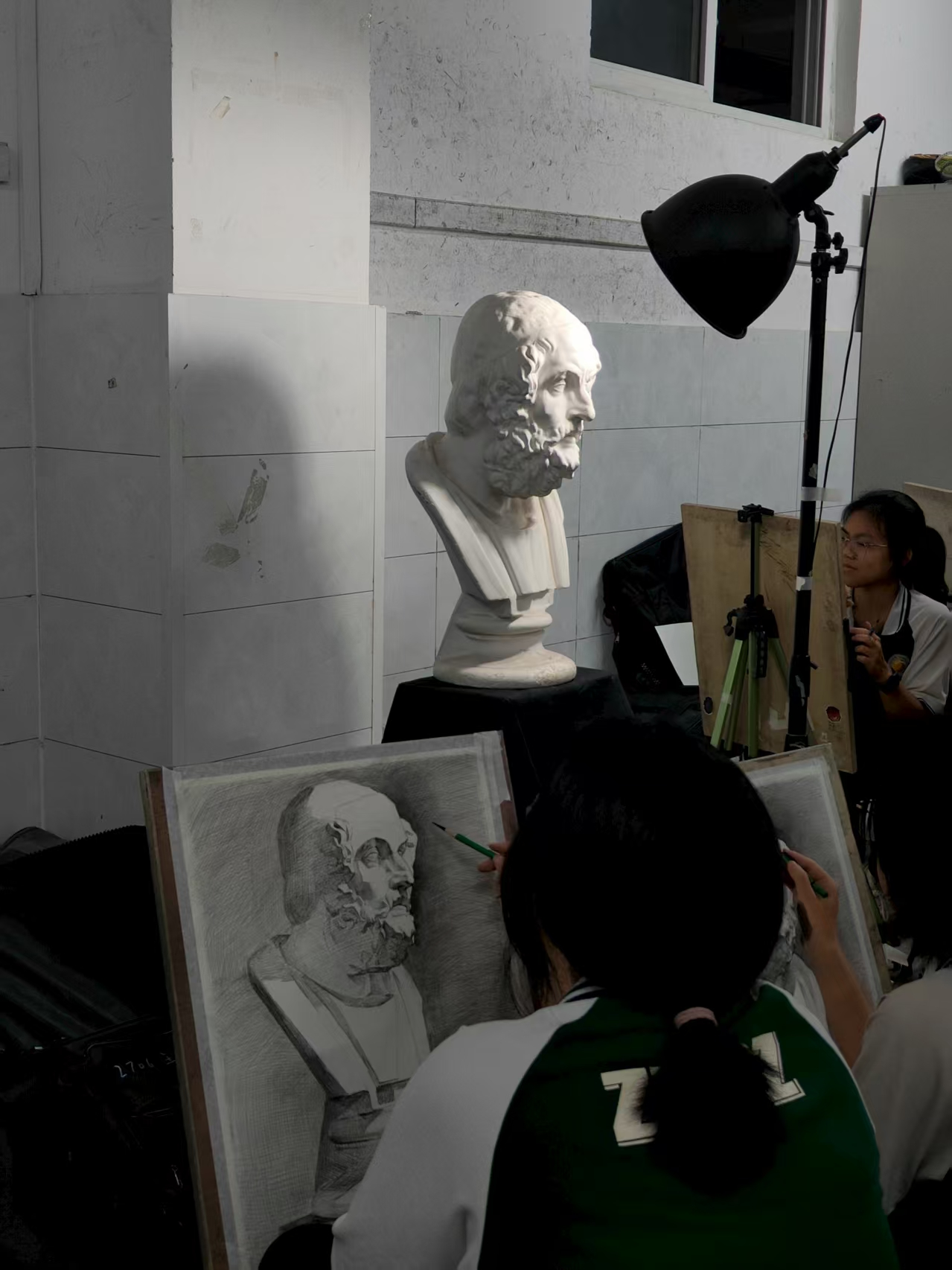 老师带领学生们进入画室,详细讲解了石膏像素描的基本技巧,包括线条的运用、光影的表现以及细节刻画。学生们认真观察、细心描绘,在浓厚的艺术氛围中,纷纷拿起画笔开始自己的创作。素描石膏像作为美术基础课程的重要组成部分,不仅能提高学生的观察力,还能锻炼他们的艺术感觉与表现能力。