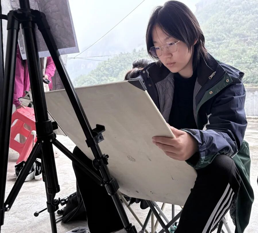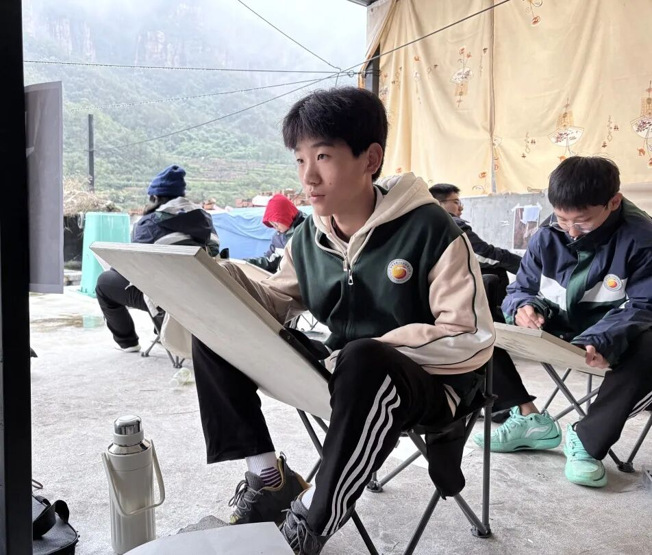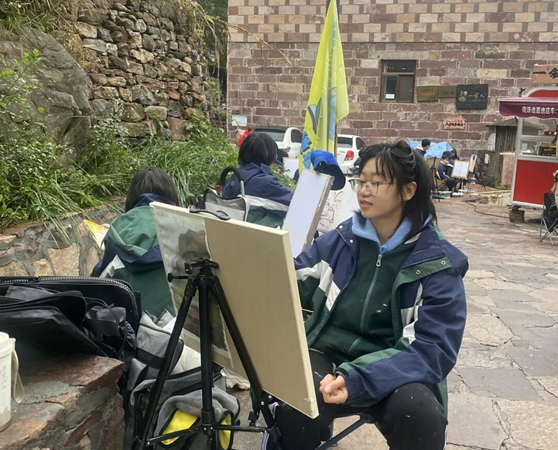 早餐后,同学们整理好画具行囊,满怀对创作的憧憬,踏上了新一天的写生旅程。他们在山间各自寻觅独特的视角,揣摩同一片风景里蕴藏的不同诗意——目光细细抚过山石的纹理,心灵与自然默默对话,最终将所有的感悟凝聚于笔端。这群年轻的“诗人”正在天地间找寻属于自己的艺术语言,以画笔构建独属于内心的精神家园。高一的学生们追逐着光影的变幻,以灵动而富有韵律的线条勾勒山峦的轮廓、林木的葱茏与水中的倒影,在虚实交错间编织着对世界的感知。高二的同学则沉醉于色彩的对话,将秋日的韵味通过层层晕染定格在画纸上:赭石、金黄与绯红在他们的调色盘上起舞,一幅幅跃动着生命力的画作,正从青春的笔尖诞生。