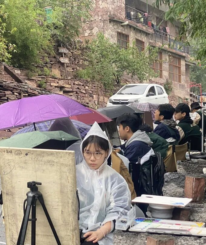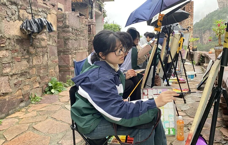 雨雾盈盈,凉风习习,半山居雾若带然般的朦胧雾气,顺着太行山南段的曲折峡谷,汇集在了石板岩镇上。新的一天开始了,我们将用镜头定格光影,用笔墨铺陈故事,来记录一〇六高中学子的太行写生一日,书写他们笔绘山河色、诗吟少年志的昂扬风韵。