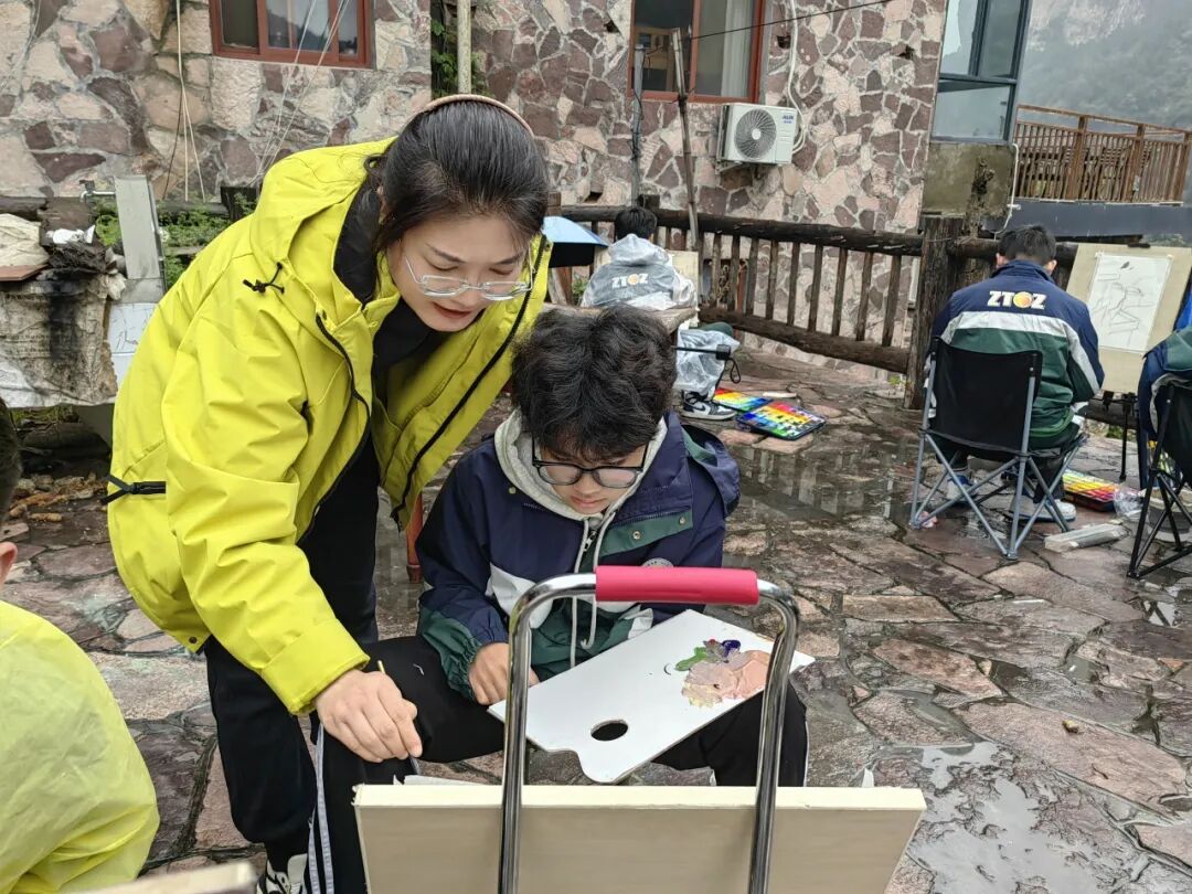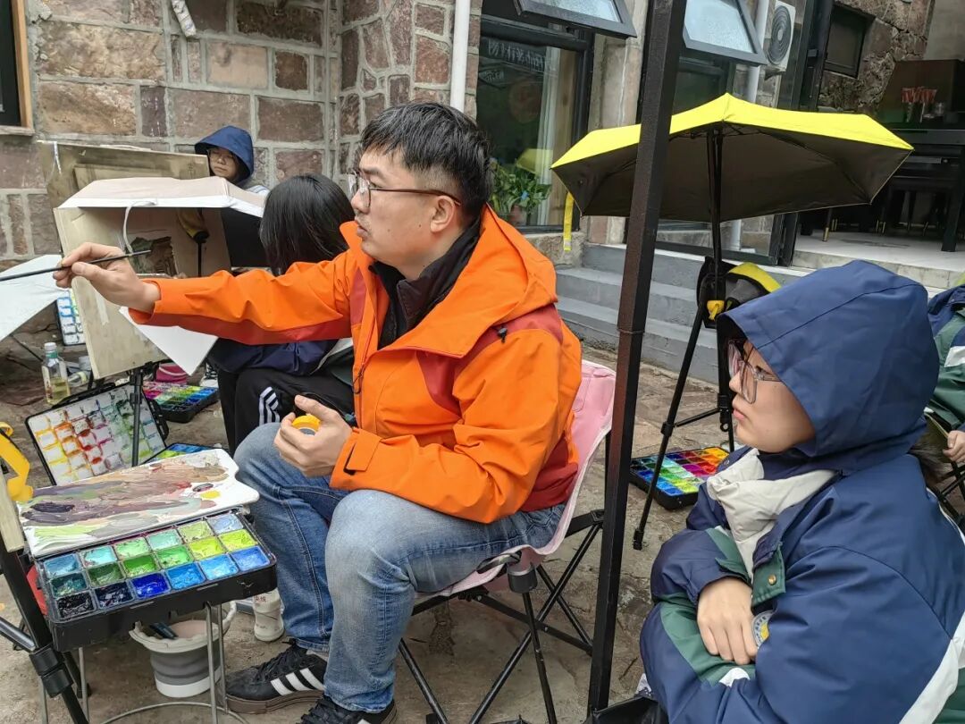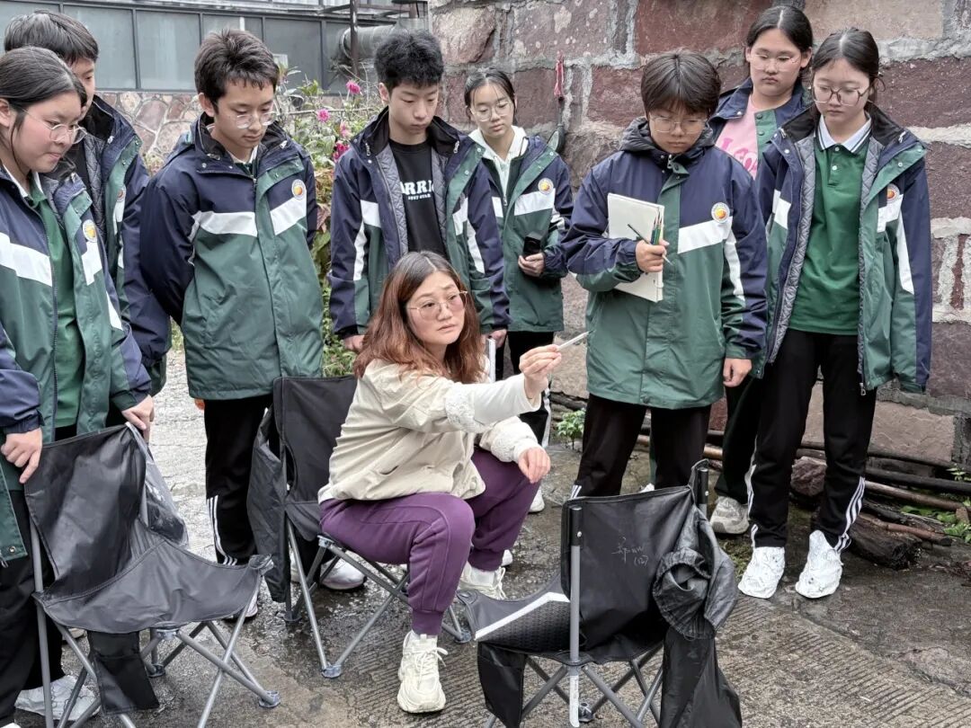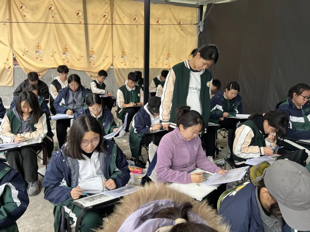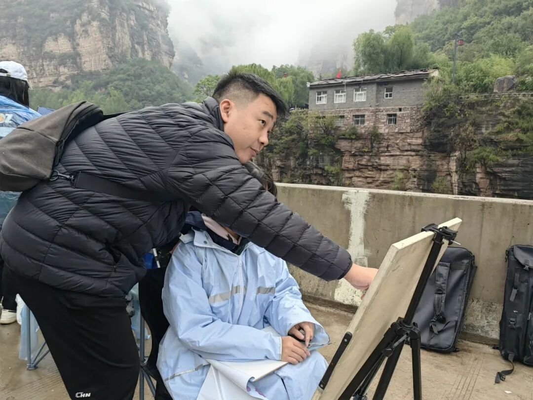 早餐用毕,学生们在班主任与美术教师的引领下,擎着鲜明的班旗,精神焕发、步履轻快地向各自的写生点进发。其间,美术教师们最为忙碌:待安顿好学生的位置,分派下小组的描绘任务,便穿梭在溪涧之畔、古树荫下、峭壁崖边,为学生们点拨适宜的景致。他们悉心引导着年轻的眼睛,于纷繁万象中凝练精粹,以细微处见宏大韵致——或以洗练的线条捕捉小景背后的深远意境;或在光影的交织变幻里,点染局部而铺陈整体,用斑斓的油彩晕染出山色的磅礴之美。每当学生执笔踌躇、面露疑难,美术老师便逐一身旁俯身,耐心指点,师生间以自由交流的笔触为语言,共同谱写着峡谷中最和谐生动的视觉乐章。