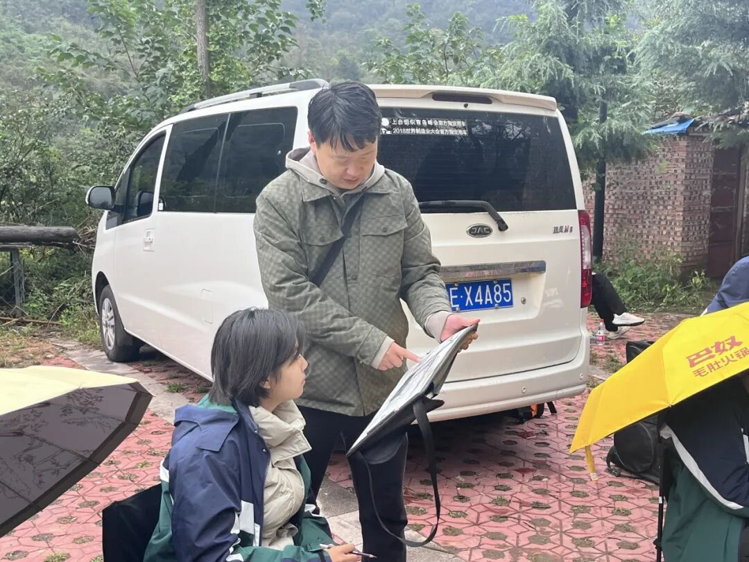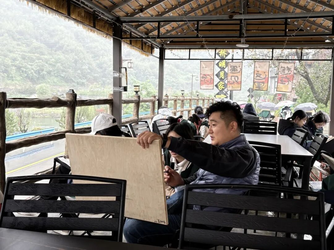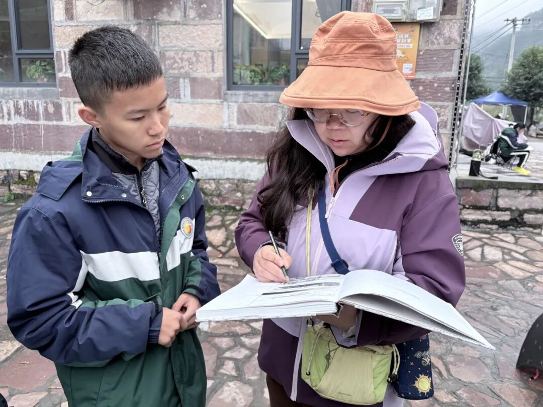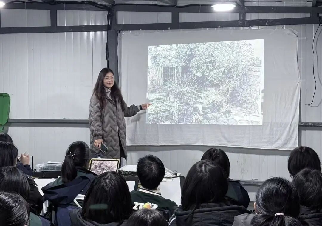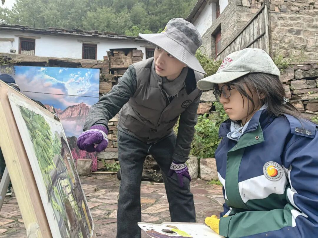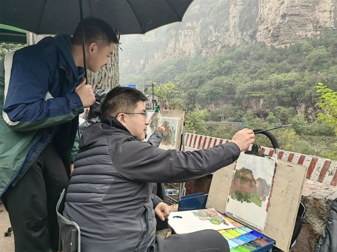 早餐用毕,学生们在班主任与美术教师的引领下,擎着鲜明的班旗,精神焕发、步履轻快地向各自的写生点进发。其间,美术教师们最为忙碌:待安顿好学生的位置,分派下小组的描绘任务,便穿梭在溪涧之畔、古树荫下、峭壁崖边,为学生们点拨适宜的景致。他们悉心引导着年轻的眼睛,于纷繁万象中凝练精粹,以细微处见宏大韵致——或以洗练的线条捕捉小景背后的深远意境;或在光影的交织变幻里,点染局部而铺陈整体,用斑斓的油彩晕染出山色的磅礴之美。每当学生执笔踌躇、面露疑难,美术老师便逐一身旁俯身,耐心指点,师生间以自由交流的笔触为语言,共同谱写着峡谷中最和谐生动的视觉乐章。