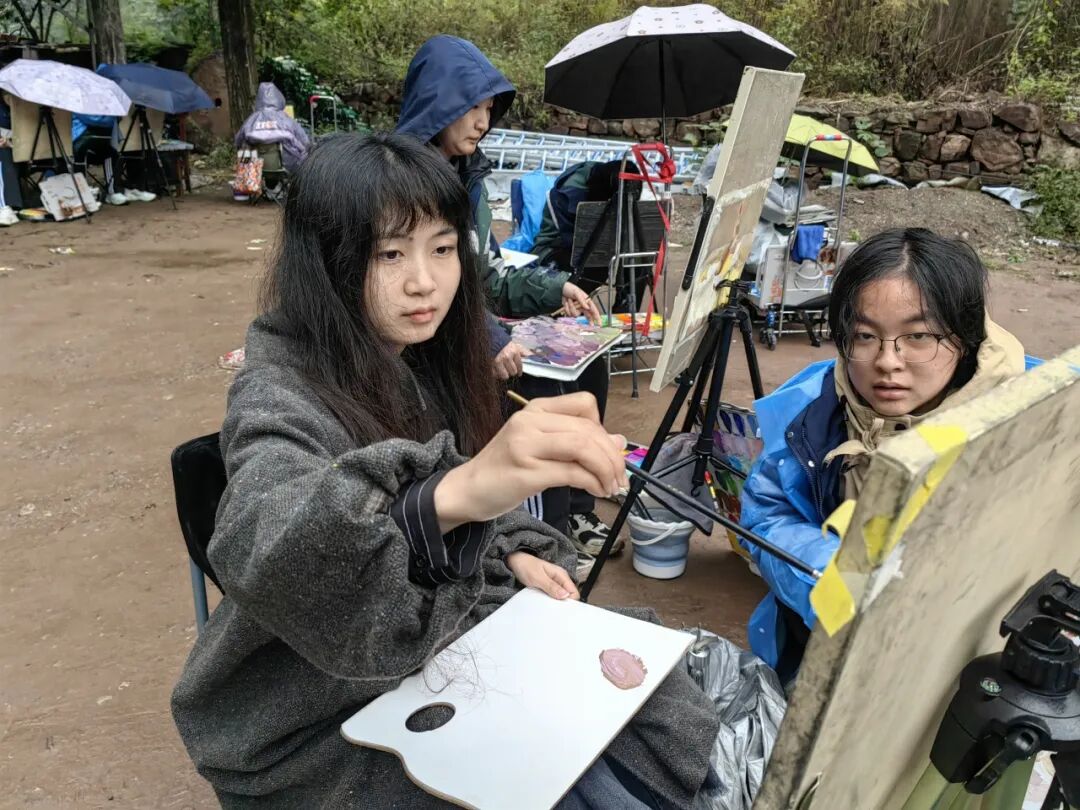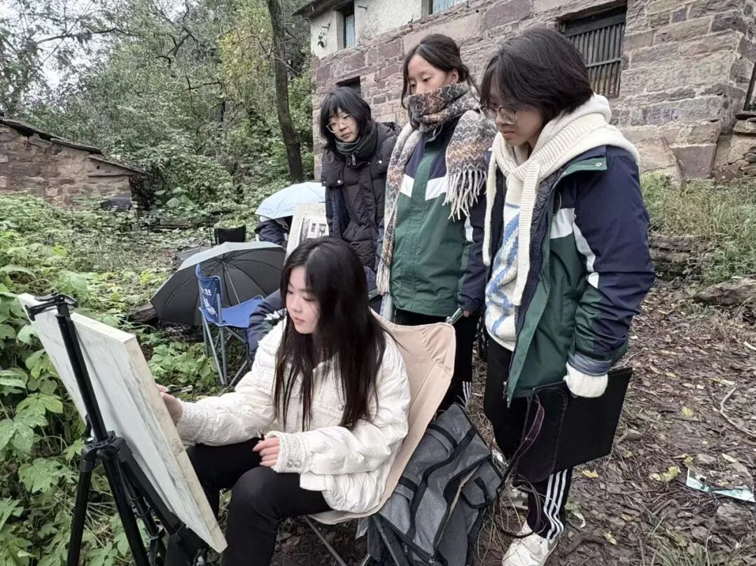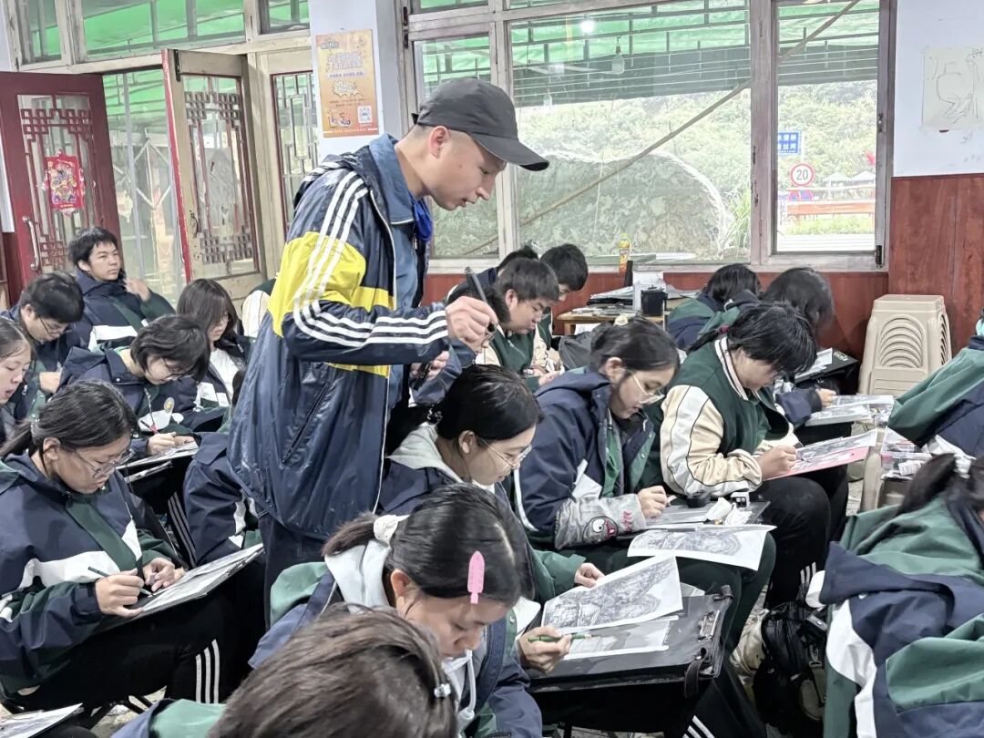 峡谷天光,阴晴难测,流云翻涌,瞬息变幻。然美术先生们兀自岿然,固守其位,无惧风雨晴晦之反复。当丽日破云,金辉遍洒,他们便将学生们聚拢在一起,就绘画中的共症通病,一一释疑解惑。学生们或凝神静听,或交相论辩,于师长的点拨与同学的切磋中豁然开朗。继而,那悟得的点滴,便化作笔尖沙沙,悄然染就于素纸之上。若逢阴雨缠绵,霏霏不绝,老师们亦惜时如金,不教分秒虚掷。或执学生画稿,俯首细审,逐幅点评,殷殷反馈如琢如磨;或谆谆教诲,其声切切,似春日草间虫鸣,萦绕耳际;或声声勉励,其情真真,若炎夏穿林凉风,沁人心脾,抚平烦扰。此间所付,在师者为心血,在学者则为滋养——寸阴不弃,春华秋实。