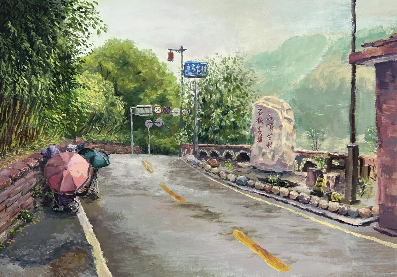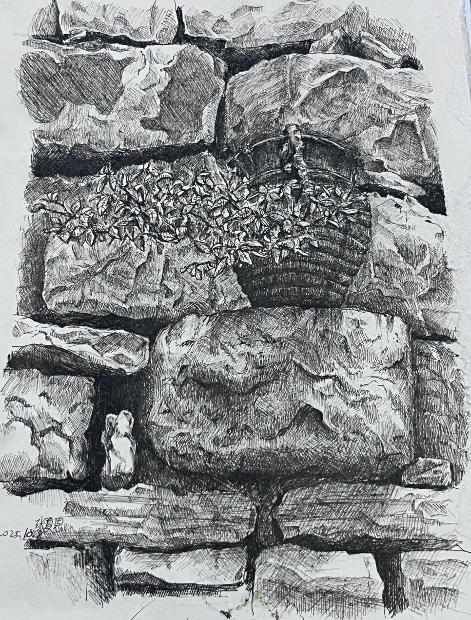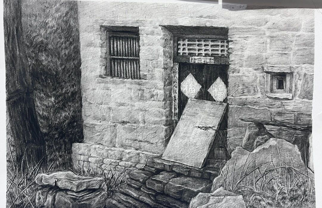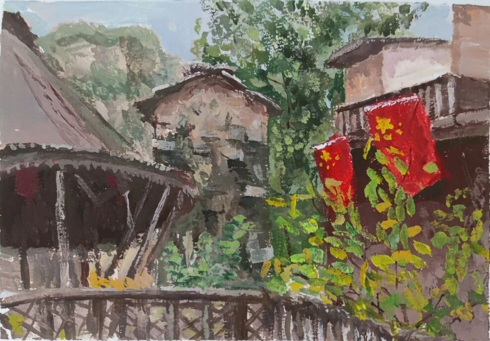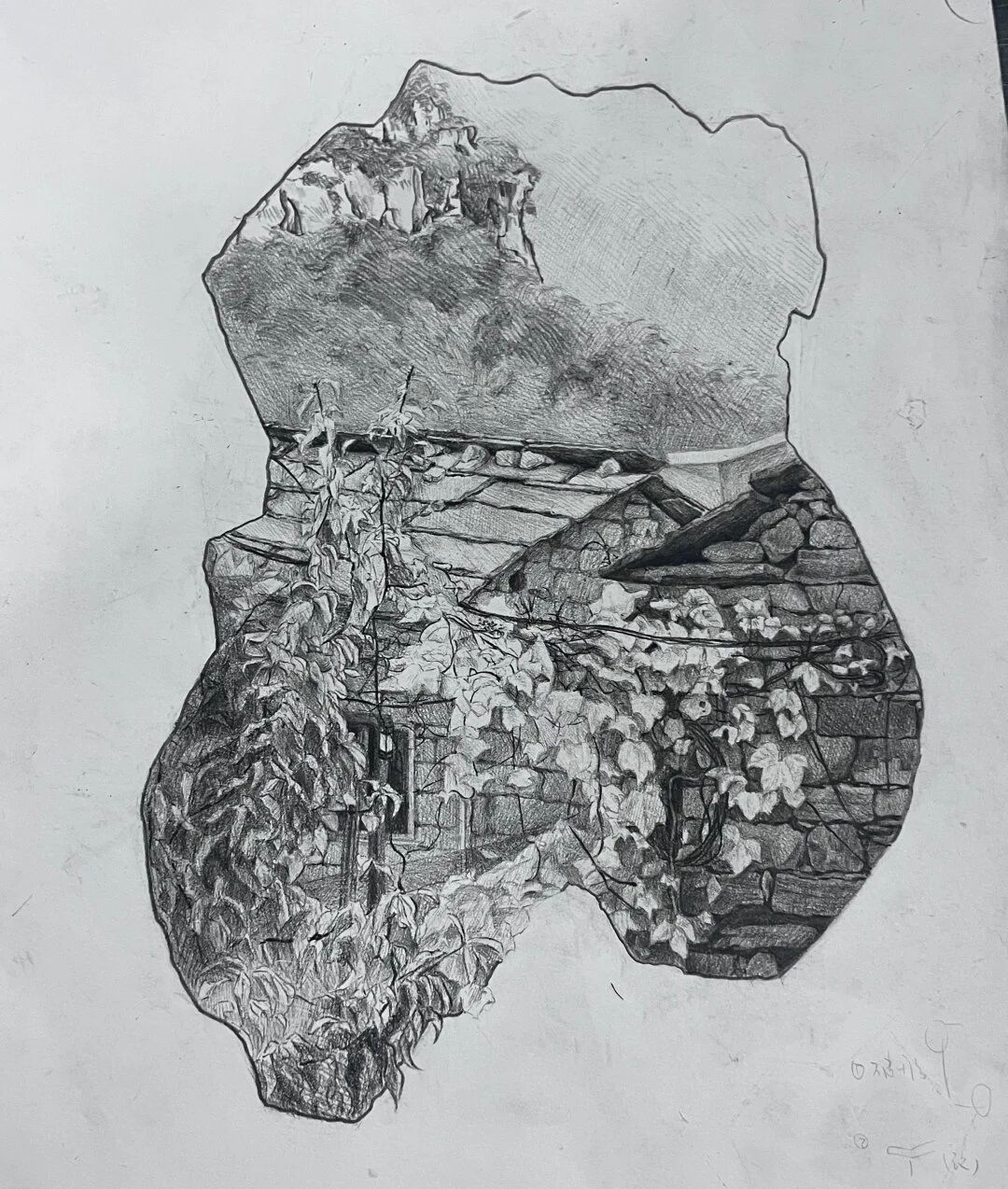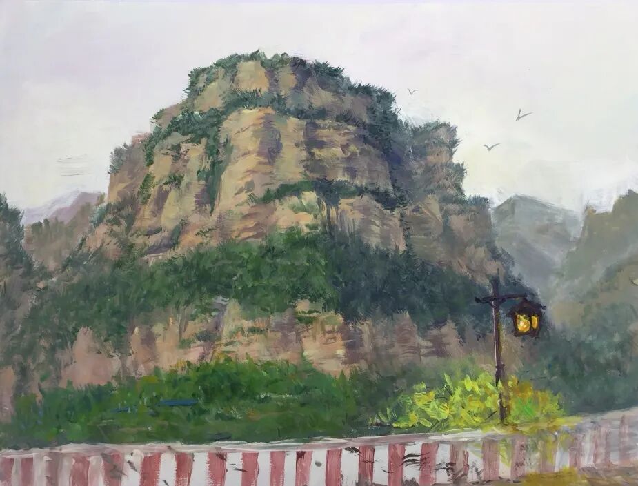 十月的石板岩完全没有了往日的清爽与冷峻,湿漉漉的雾水时不时从峡谷的另一端蔓延开来,混沌的天空和逐渐失色的悬崖悄悄融合,光影变得晦涩而迷蒙,这无疑给学生们作画增添了麻烦。同学们无惧这惨淡的天气,反而静下心来观天地而雕细微,一幅幅精彩的画作也呈现出来。挑战磨砺了意志,意志点染了心性,心性塑造了艺术。