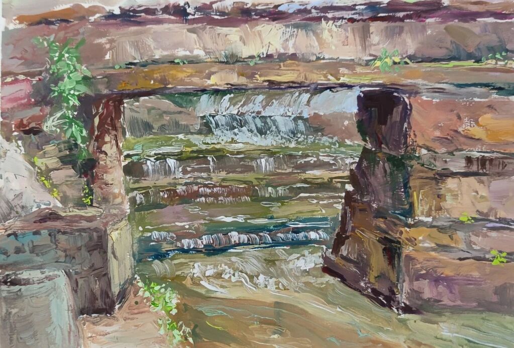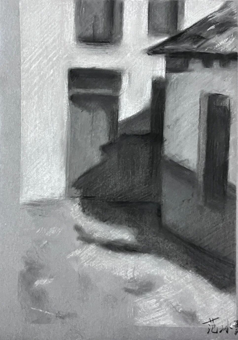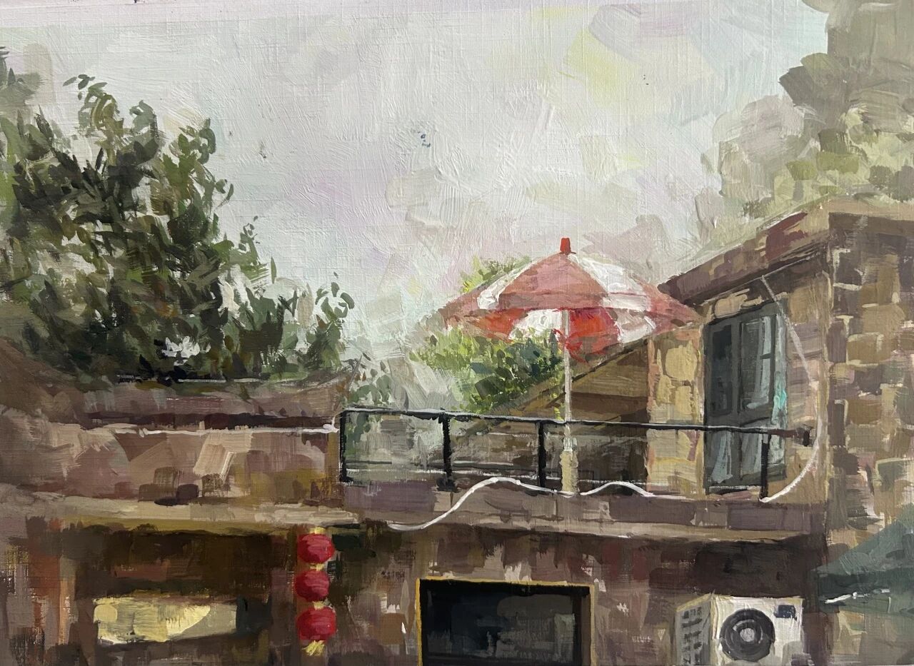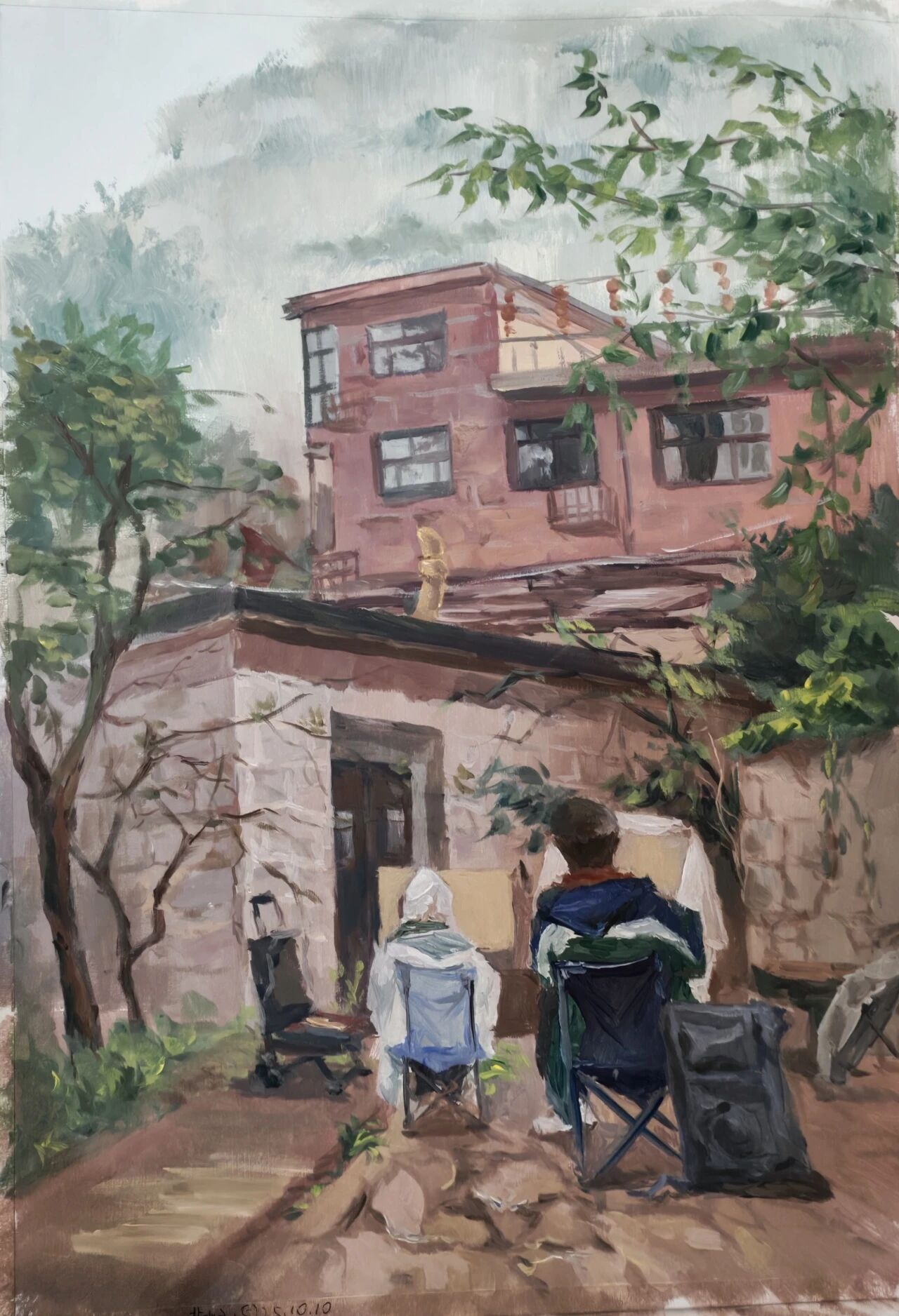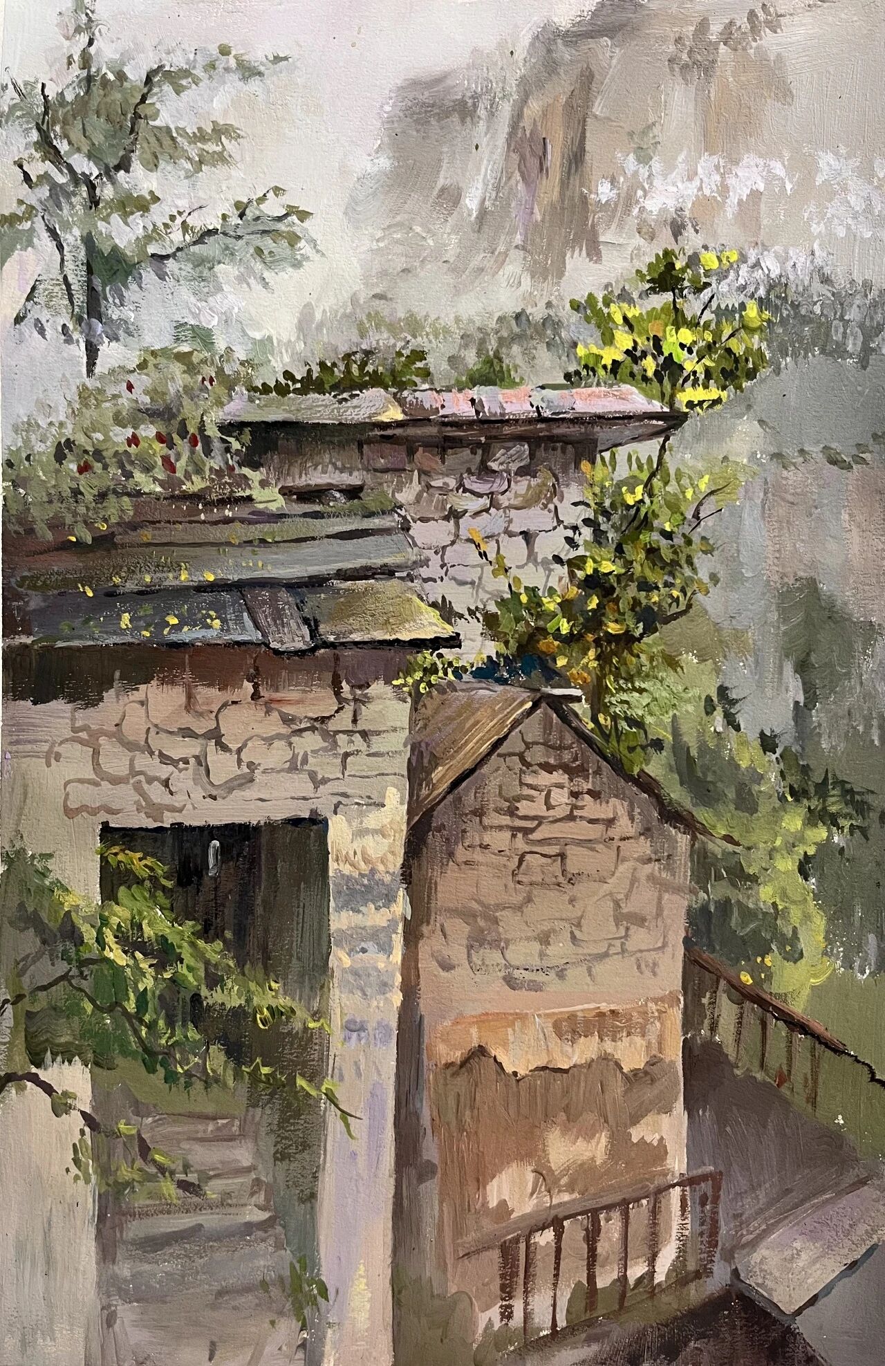 十月的石板岩完全没有了往日的清爽与冷峻,湿漉漉的雾水时不时从峡谷的另一端蔓延开来,混沌的天空和逐渐失色的悬崖悄悄融合,光影变得晦涩而迷蒙,这无疑给学生们作画增添了麻烦。同学们无惧这惨淡的天气,反而静下心来观天地而雕细微,一幅幅精彩的画作也呈现出来。挑战磨砺了意志,意志点染了心性,心性塑造了艺术。