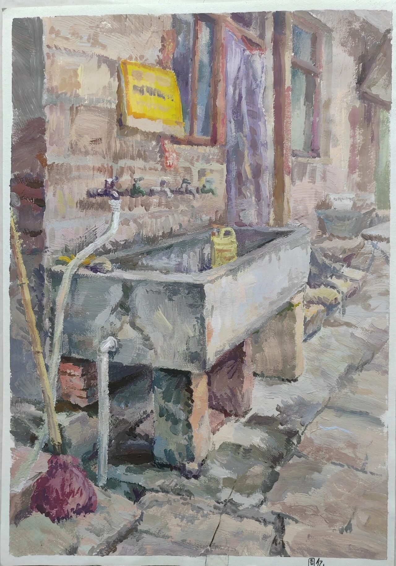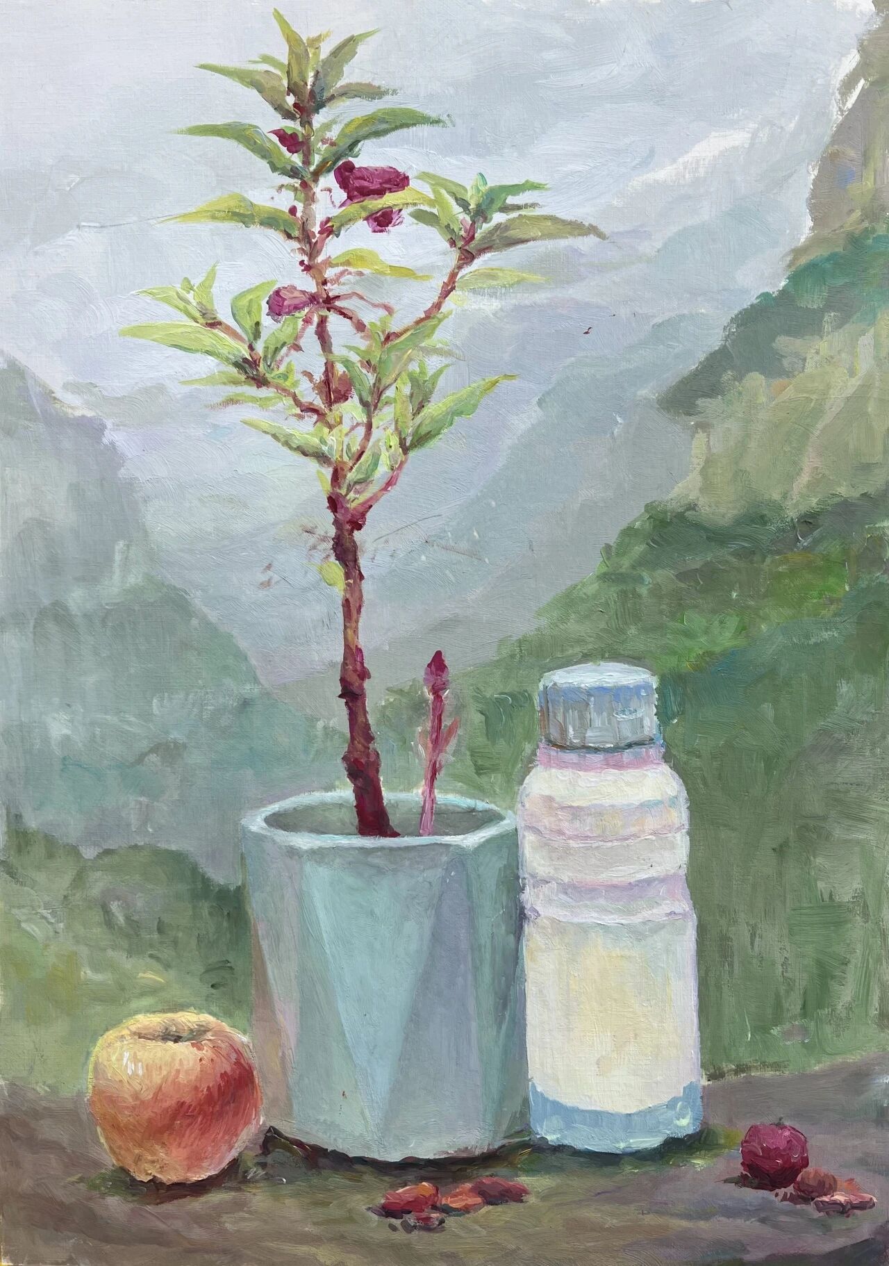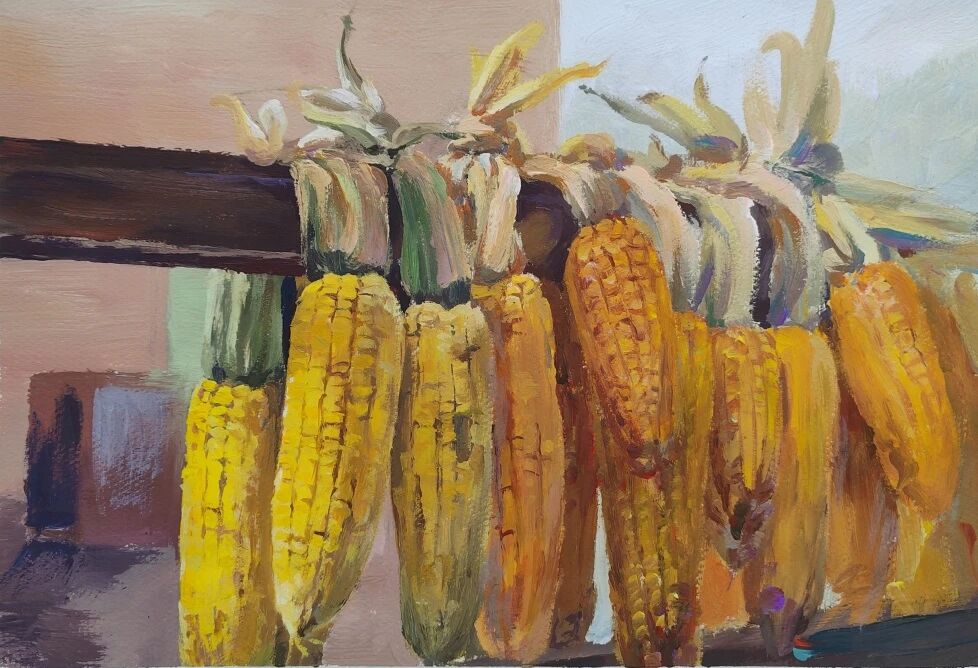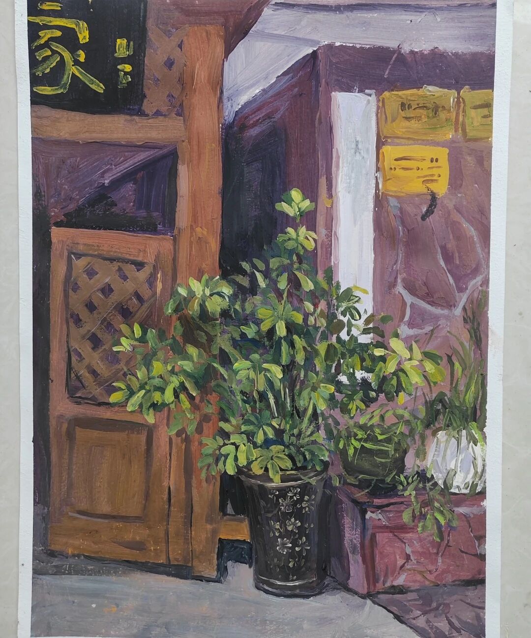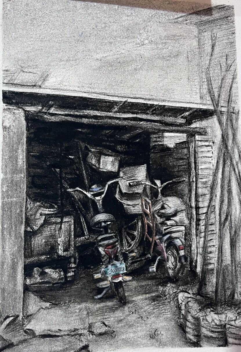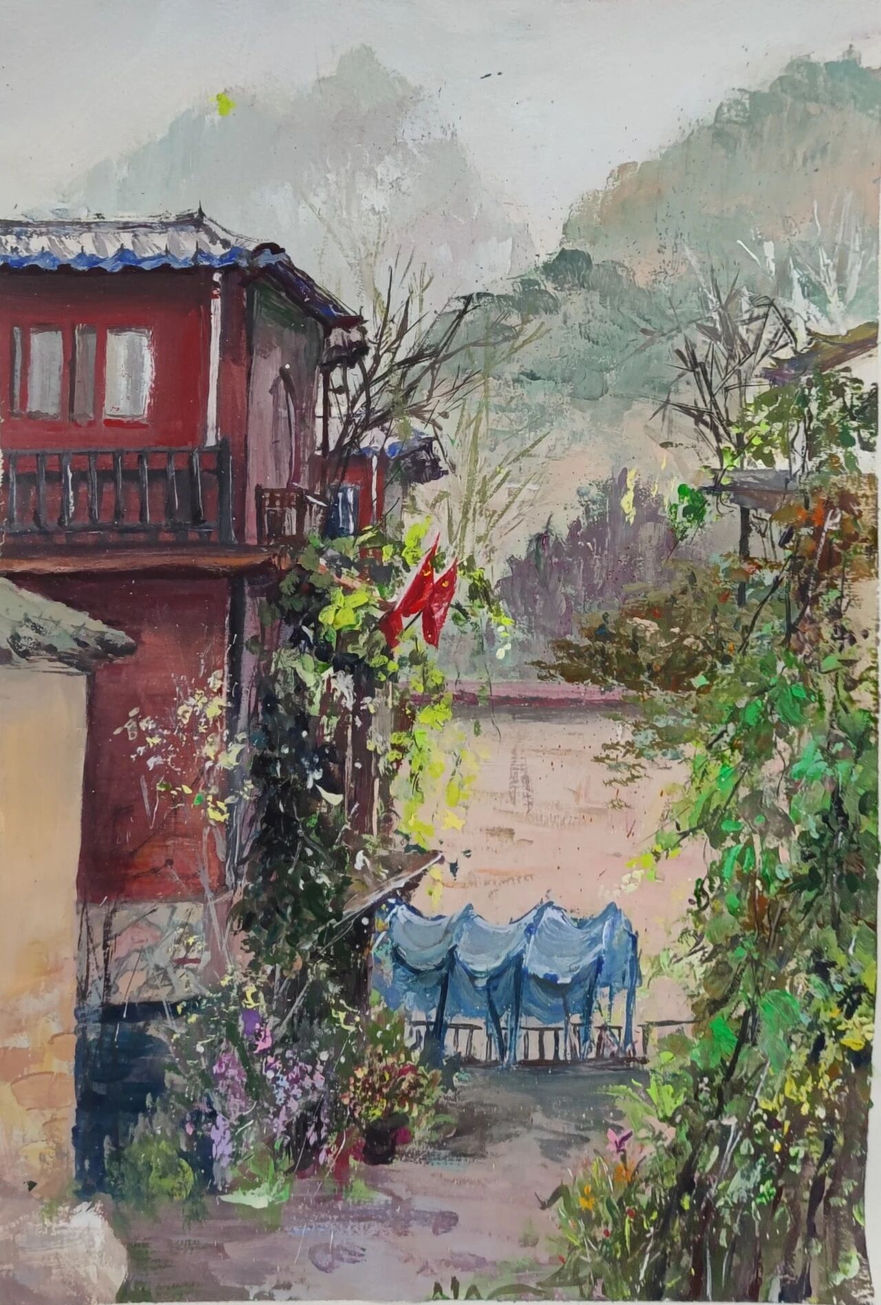 十月的石板岩完全没有了往日的清爽与冷峻,湿漉漉的雾水时不时从峡谷的另一端蔓延开来,混沌的天空和逐渐失色的悬崖悄悄融合,光影变得晦涩而迷蒙,这无疑给学生们作画增添了麻烦。同学们无惧这惨淡的天气,反而静下心来观天地而雕细微,一幅幅精彩的画作也呈现出来。挑战磨砺了意志,意志点染了心性,心性塑造了艺术。