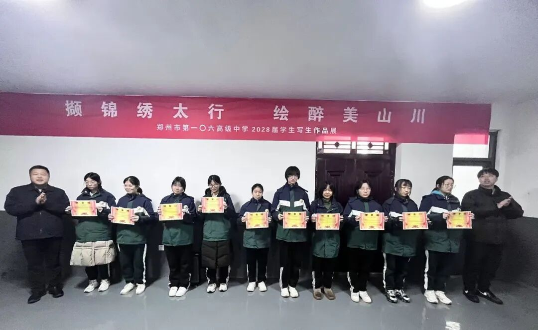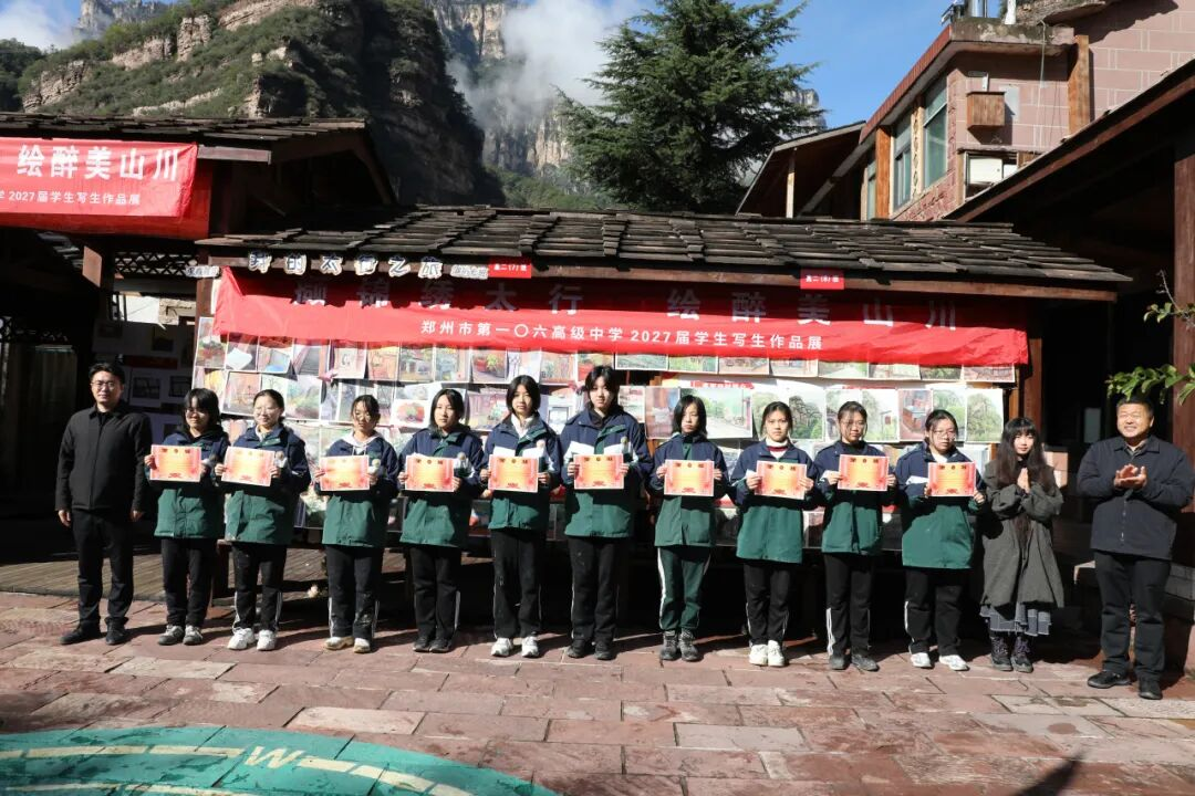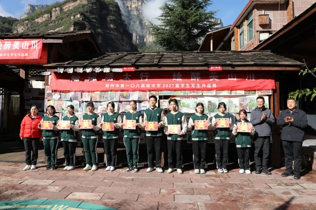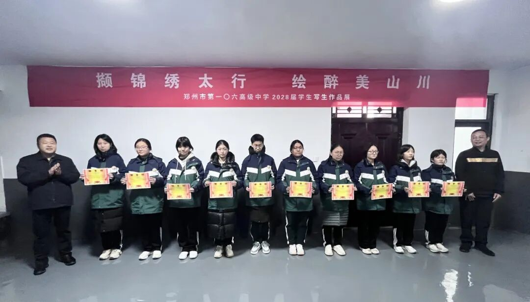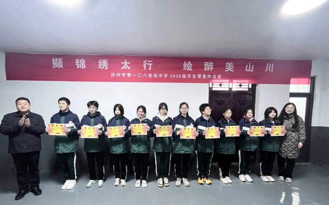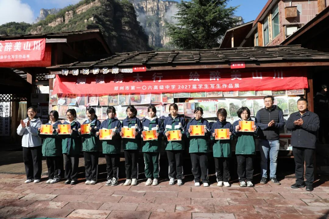 为展示学生优秀画作,促进同学之间学习交流,郑州市第一〇六高级中学高一、高二年级在石板岩举办了写生优秀作品展。校党委书记李明德参加了以“撷锦绣太行,绘醉美山川”为主题的学生画展并为获奖学生颁发奖项。