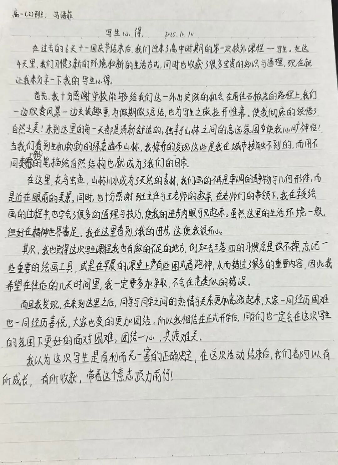 秋风送爽,白云舒卷;草木染金,雁阵南翔。短短十日,郑州市第106高级中学的学子们怀抱艺术热忱,手绘丹青,情溢太行,在诗意的石板岩圆满完成了秋日写生之旅。旅程虽暂告段落,然学子心中对师长的感恩、对石板岩的眷恋、对艺术真谛的求索、对生命成长的体悟,却如太行秋叶,愈显绚烂,历久弥新。