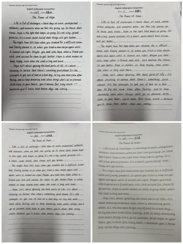 高一年级聚焦英文书写规范,举办了为期一个月的英语书法大赛。全体高一学生踊跃参与自主练字活动,在一笔一画中感受英文书写的韵律与美感。比赛当天,在15至20分钟的规定时间内,学生工整抄写指定英文美文,字迹或清秀娟丽,或刚劲有力,卷面整洁规范,充分展现了扎实的书写功底。