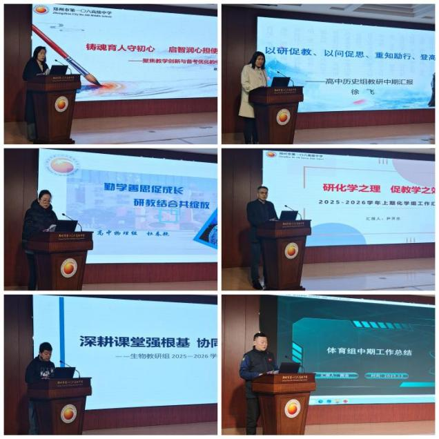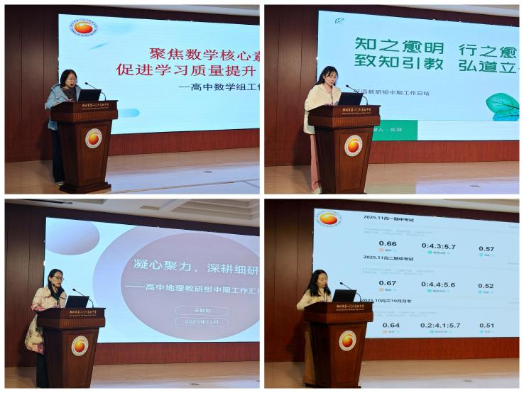 会议伊始,各学科教研组长依次进行汇报。组长们聚焦教学质量复盘、课程教学实施、教研成果梳理及教师团队建设等重点板块,结合学科特色进行了详细阐述。语文组探索AI赋能教学、数学组深耕核心素养培育、英语组推进分层教学实践、地理组创新真实情境实验,各学科亮点纷呈;同时,各组也坦诚剖析了命题难度把控、学段衔接不畅、青年教师成长支持等共性挑战,并提出技术赋能教学、深化课标落地、贯通学段教研等针对性改进思路,充分展现了各教研组务实进取、直面问题的专业姿态。