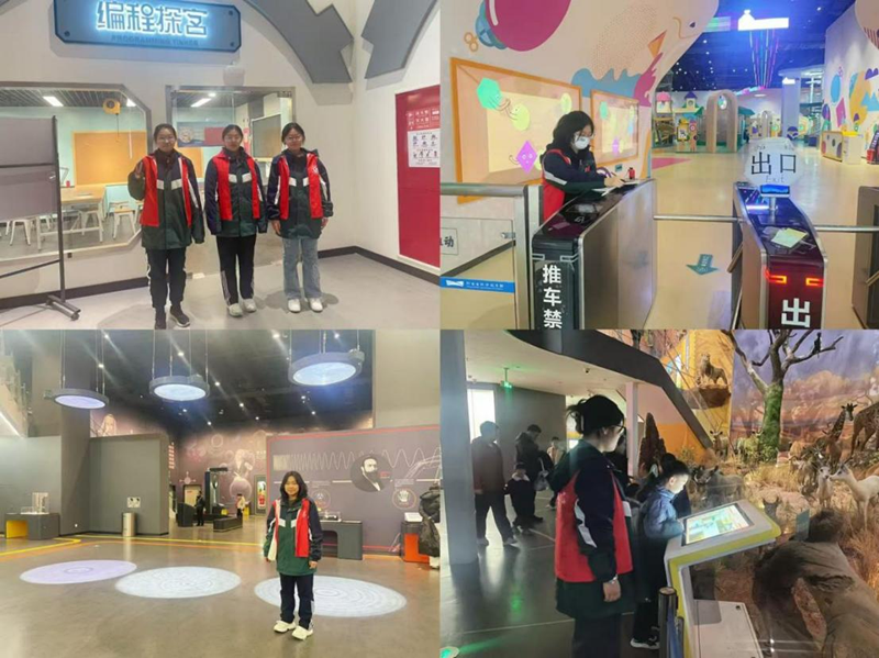 服务过程中,志愿者们主动上前提供帮助:帮小朋友操作互动设备,为有需要的游客指引路线,解答与展项相关的疑问,在游客身体不适时及时伸出援手。他们细致周到的服务,赢得了现场游客的一致好评。活动结束后,全体参与师生在科技馆内合影留念,定格此次 “科技 + 志愿” 的实践瞬间。