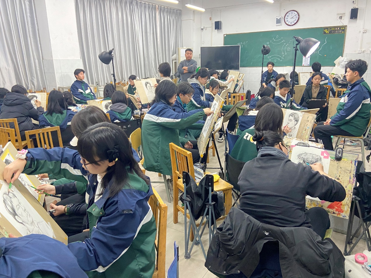 学期临近尾声,郑州市第一〇六高级中学的美术专业学生们迎来一场至关重要的专业能力检验。今日,校园内画室肃静,唯有铅笔划过纸面的沙沙声与画笔调色的细微声响,构成了一曲独特的奋斗乐章。高二年级美术生期末考试正紧张而有序地进行,学生们以笔为剑,在画纸上尽情挥洒一个学期积累的学识与才华。和普通笔试考场不同,美术考场是色彩与线条流动的空间。这里没有统一的文字答案,却处处是对造型、光影、色彩和构图的精准考量。