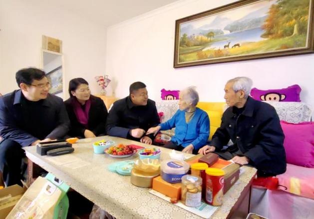 校长胡庆周和教务主任陈政向90岁的王新文老师,送上新春祝福与美好祝愿
