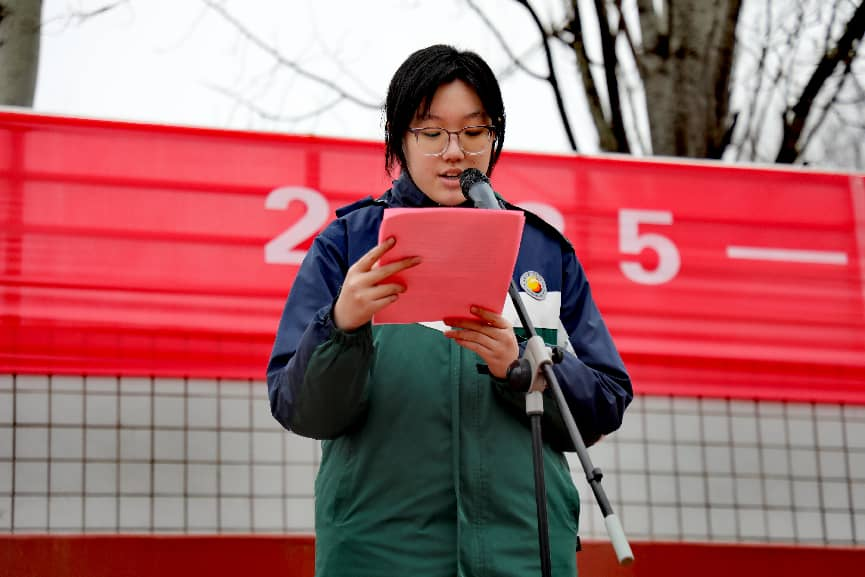 学生代表罗紫苏引用《礼记·中庸》中的“博学之,审问之,慎思之,明辨之,笃行之”与全体同学共勉。笃行不在于惊天壮举,而在于知难而上、点滴积累;致远不在于好高骛远,而在于心怀目标、立足当下。她号召大家勤学不辍、久久为功,在坚持中奔赴更广阔的未来。